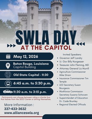 Join the SWLA Alliance and business leaders from our area at the 2026 SWLA Day at the Capitol Tuesday May 12, 2026. We will hear updates from our local delegation about what's happening this session, and hear from our state officials on legislative issues.
